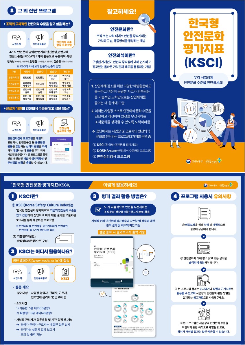 안전보건공단에서 게시한 한국형 안전문화 평가지표(KSCI) 관련 리플릿입니다.